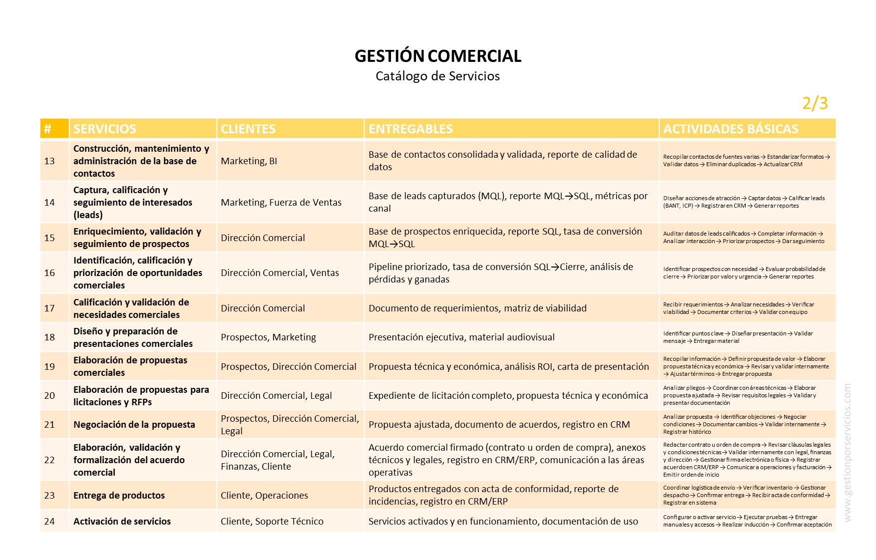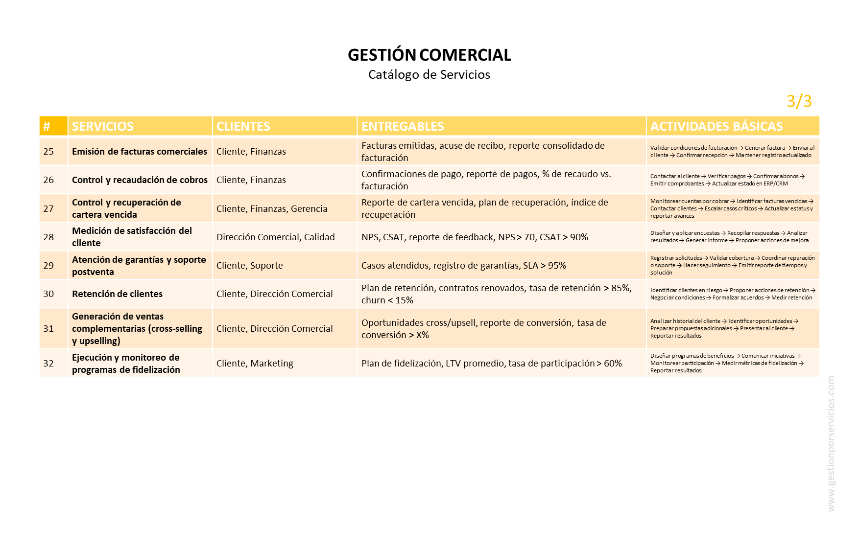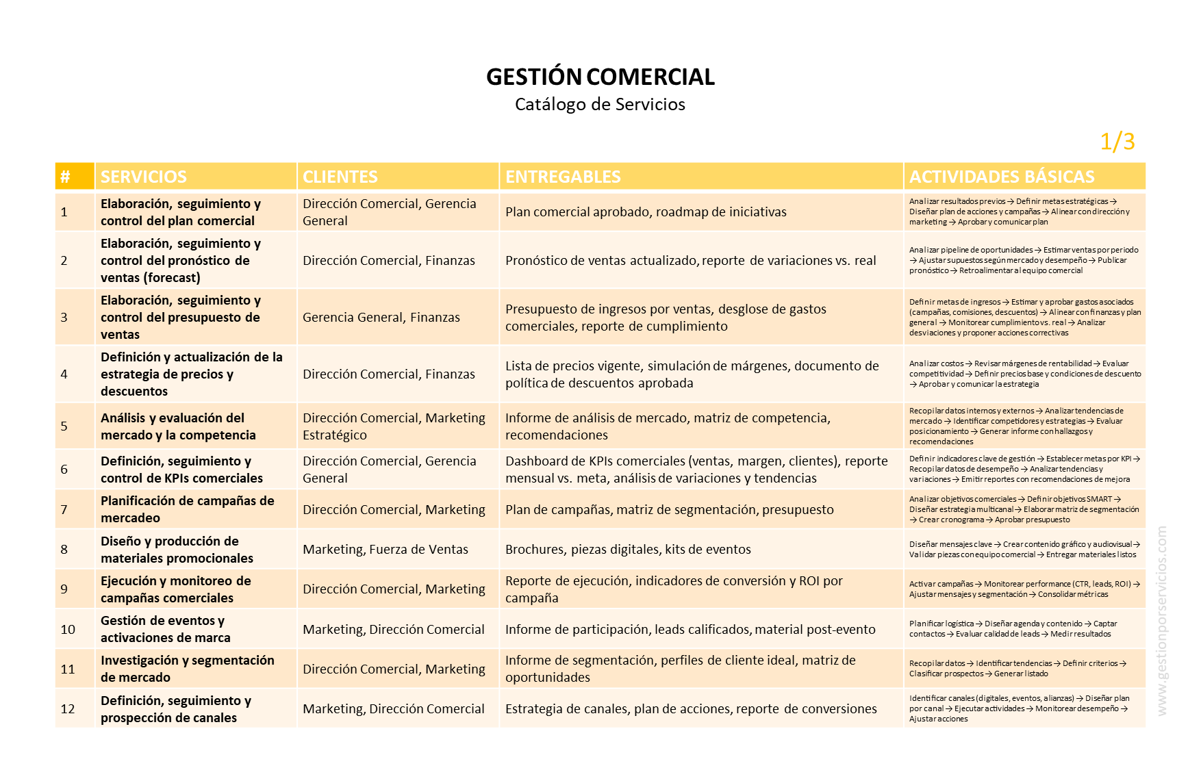 CATÁLOGO DE SERVICIOS: considerando el objetivo de gestión que antecede, el siguiente catálogo muestra los servicios operativos que un área de trabajo podría proveer como responsable de la gestión comercial de una empresa o de una institución.