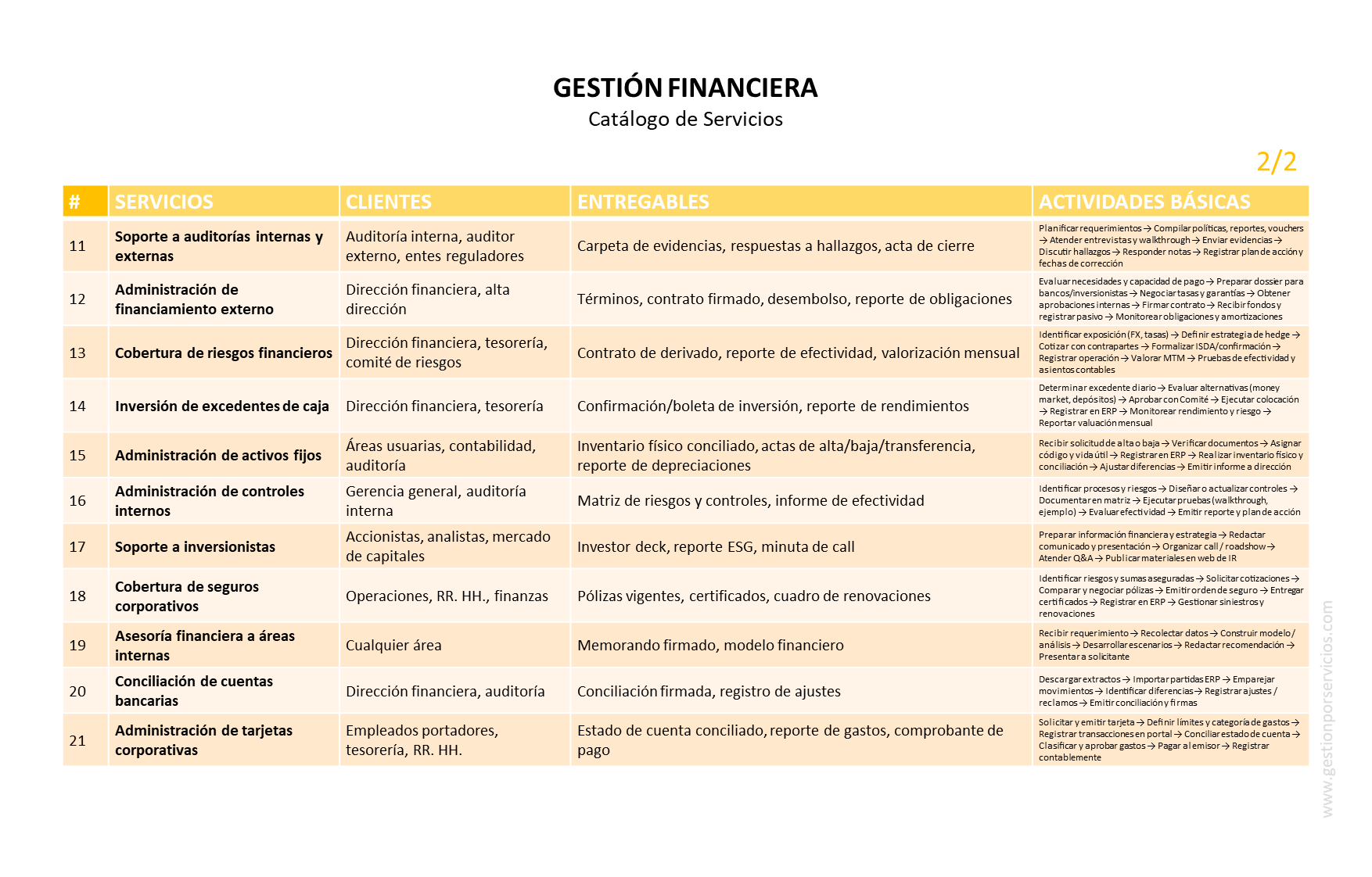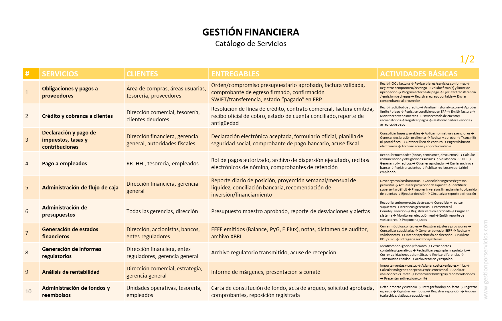 CATÁLOGO DE SERVICIOS: considerando el objetivo de gestión que antecede, el siguiente catálogo muestra los servicios operativos que un área de trabajo podría proveer como responsable de la gestión financiera de una empresa o de una institución.